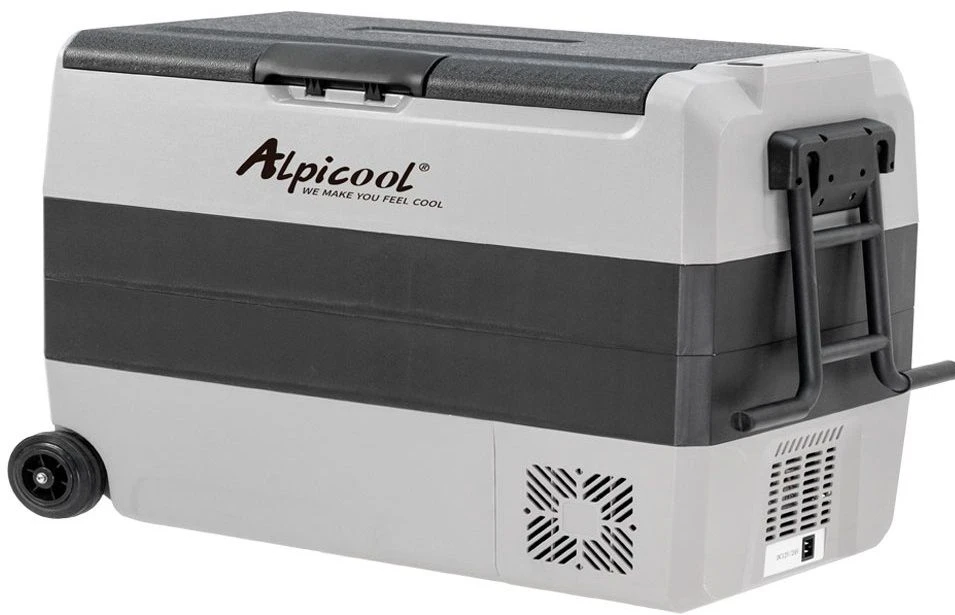 Alpicool ET60 (12/24) отличается стильным дизайном в серой гамме, который гармонично впишется в интерьер любого автомобиля. Для удобства транспортировки предусмотрены колёса, телескопическая ручка и боковые ручки. Максимальный угол наклона компрессора составляет 40 градусов, что позволяет использовать холодильник даже на неровных дорогах.