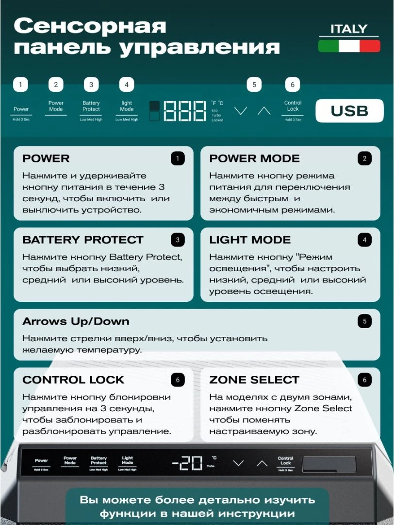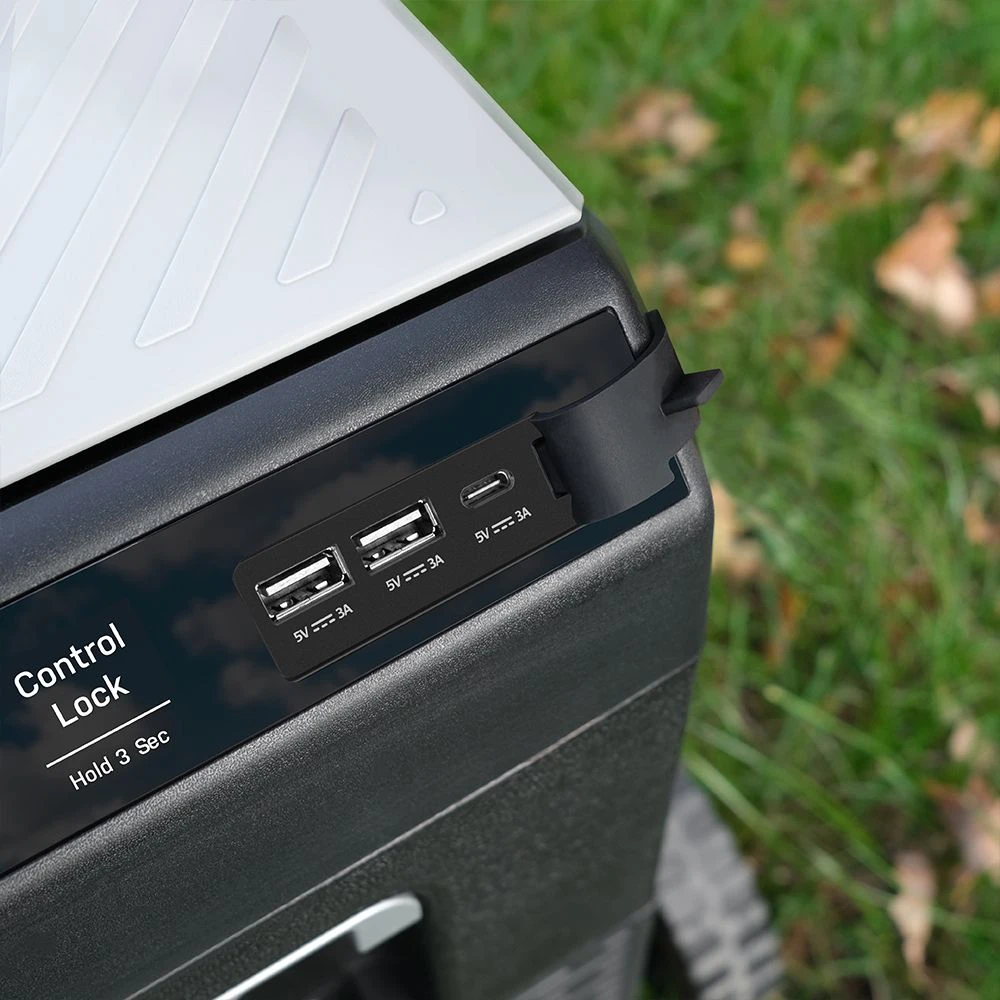 Дополнительно модель оборудована 2 USB разъемами и разъемом Type C что позволяет заряжать смартфоны и другие гаджеты прямо в пути. Для экономии энергии можно выбрать экономичный режим а для быстрого охлаждения турбо режим. Дверца надежно закрывается на защелку а сбоку предусмотрен сетчатый карман для мелочей бутылок или снеков. Компактный корпус и ручка для переноски делают холодильник удобным в использовании и транспортировке.