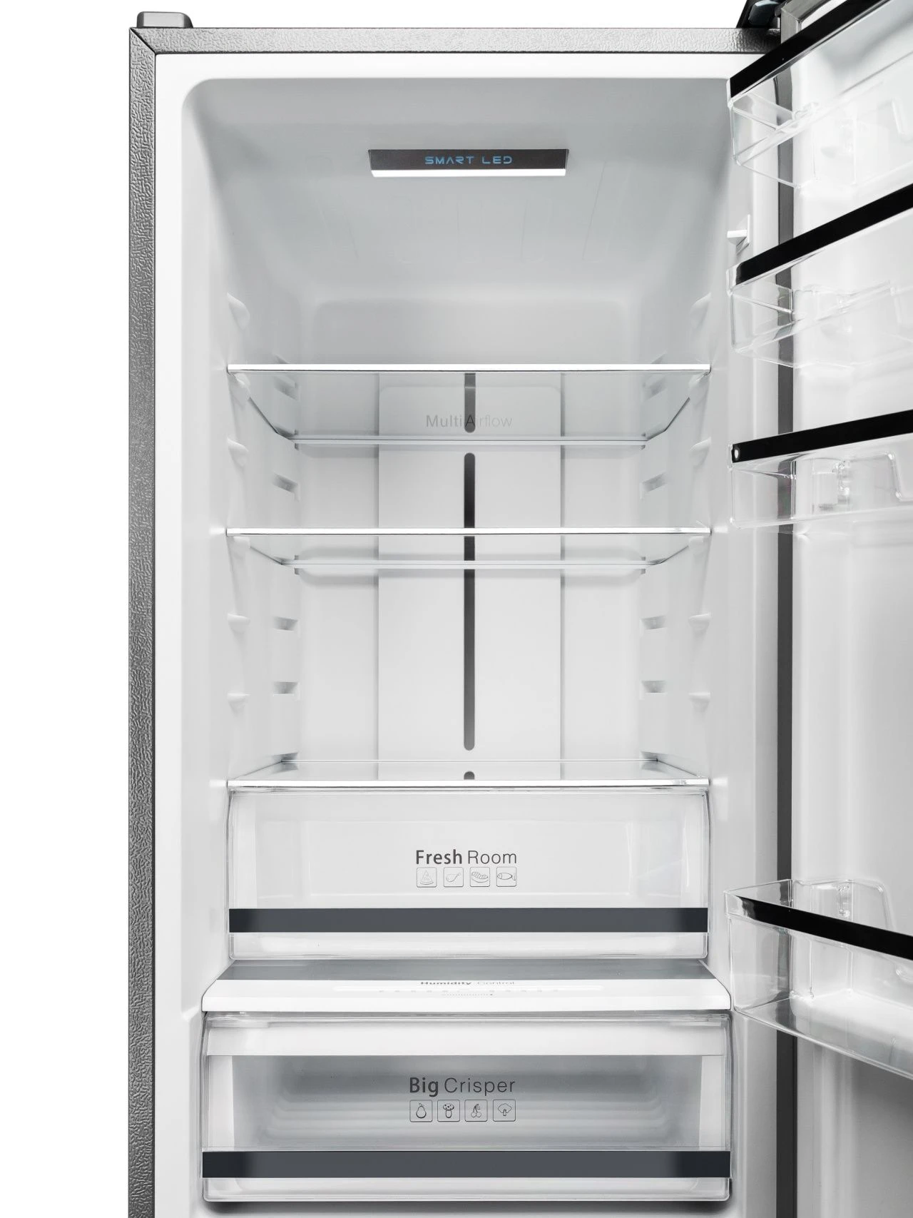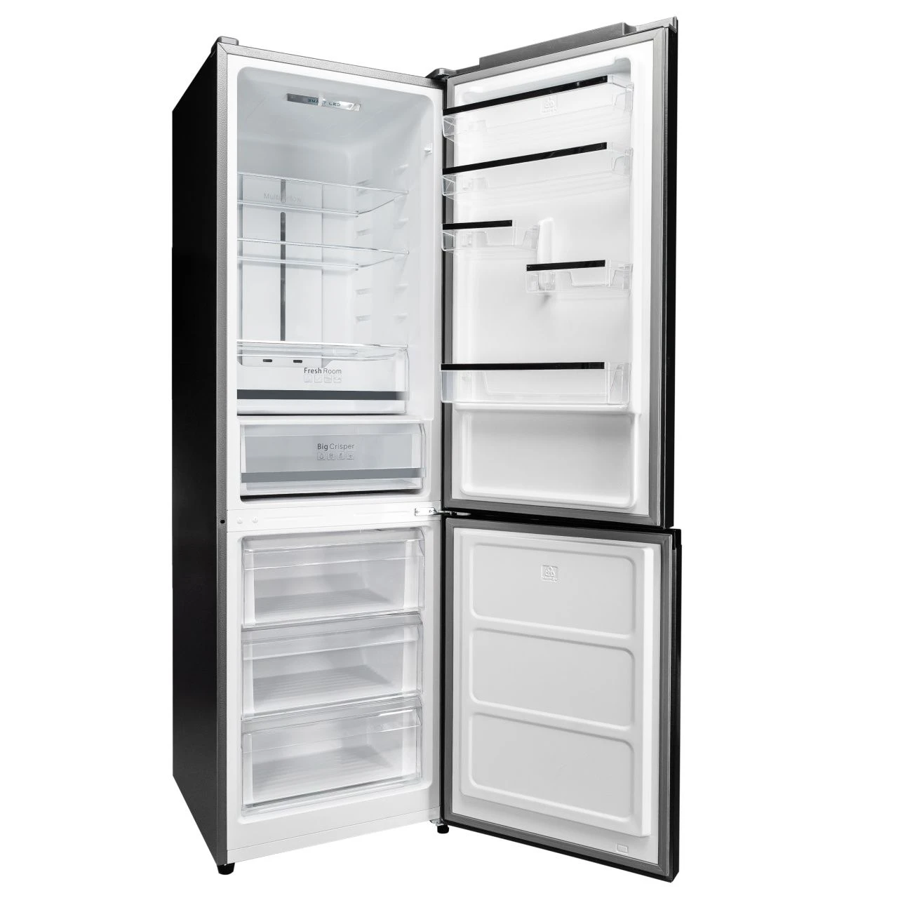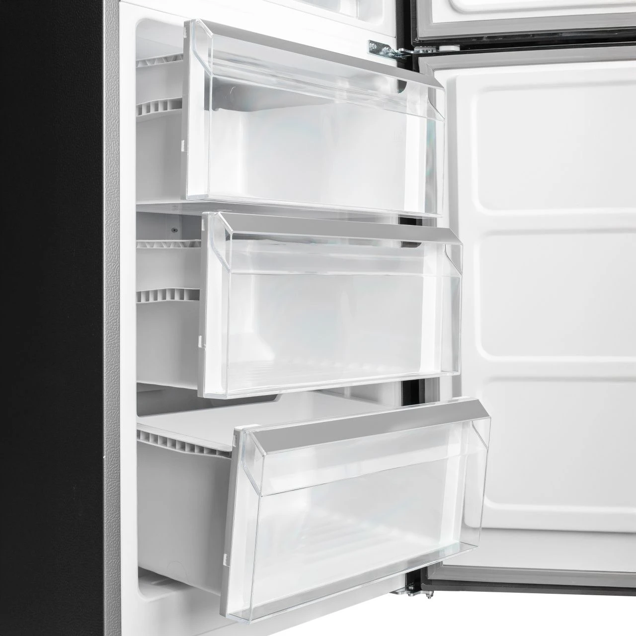 Холодильник оснащён вместительными полками, ящиками для овощей и фруктов, а также удобными дверными отсеками. Это позволяет рационально разместить продукты и быстро находить нужные позиции.