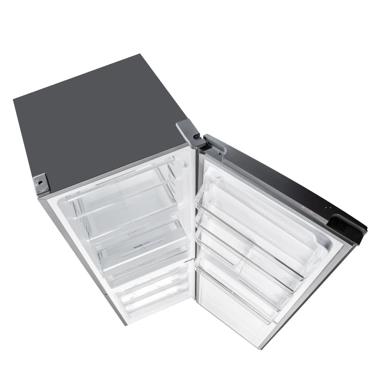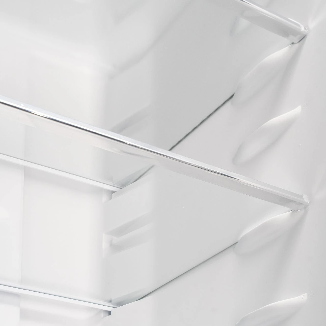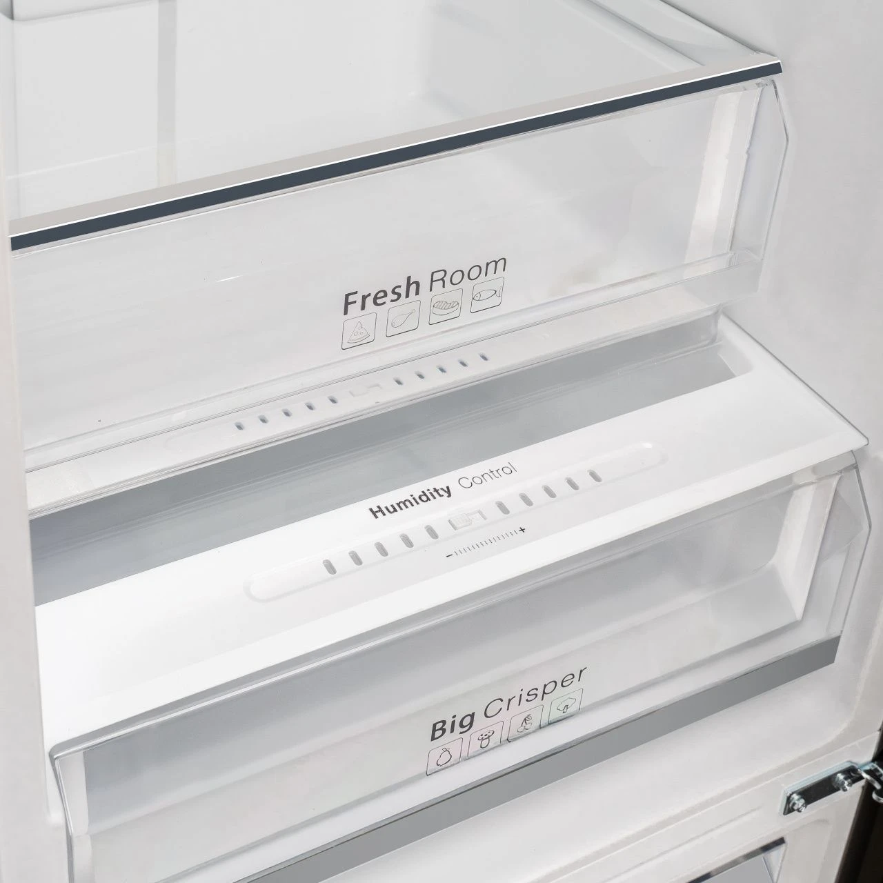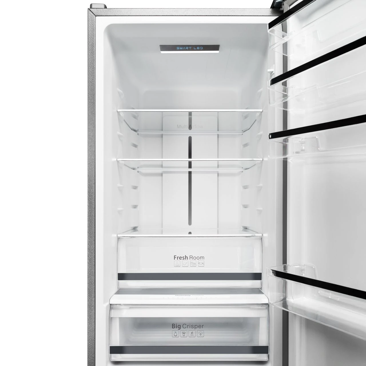 Холодильник оснащён вместительными полками, ящиками для овощей и фруктов, а также удобными дверными отсеками. Это позволяет рационально разместить продукты и быстро находить нужные позиции.