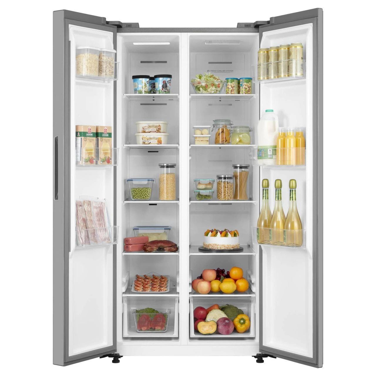Общий объем составляет 442 л, из них 266 л приходится на холодильное отделение и 176 л на морозильное. В холодильной зоне пять стеклянных полок, шесть полок на дверце, большой ящик или два контейнера для овощей и фруктов. Светодиодная подсветка равномерно освещает все уровни. В комплекте металлическая полка для бутылок и лоток для яиц. В морозильном отделении пять полок и один выдвижной ящик, лоток для льда. Производительность замораживания достигает 10 кг в сутки.