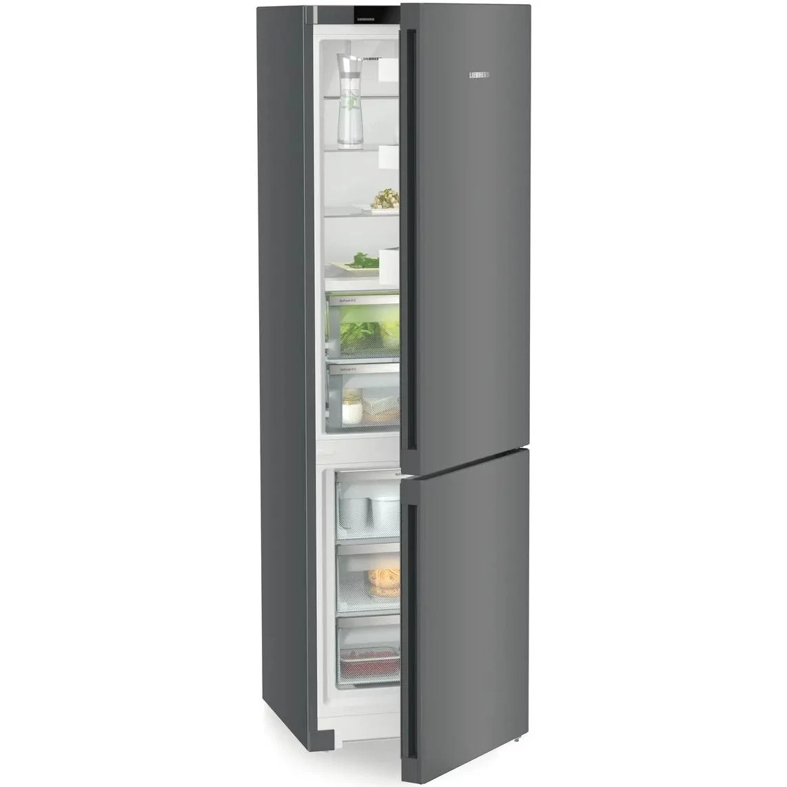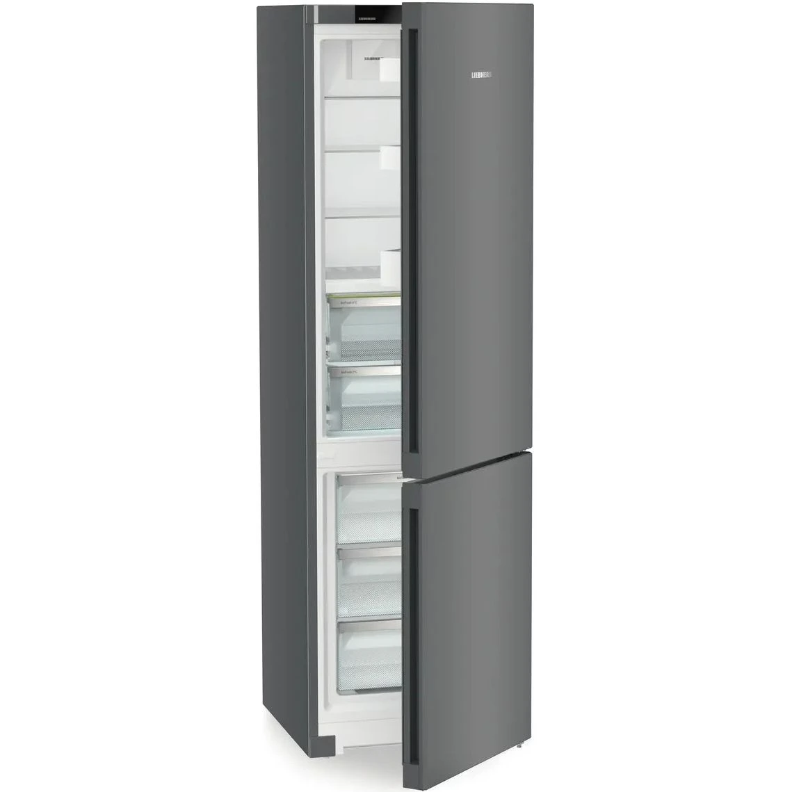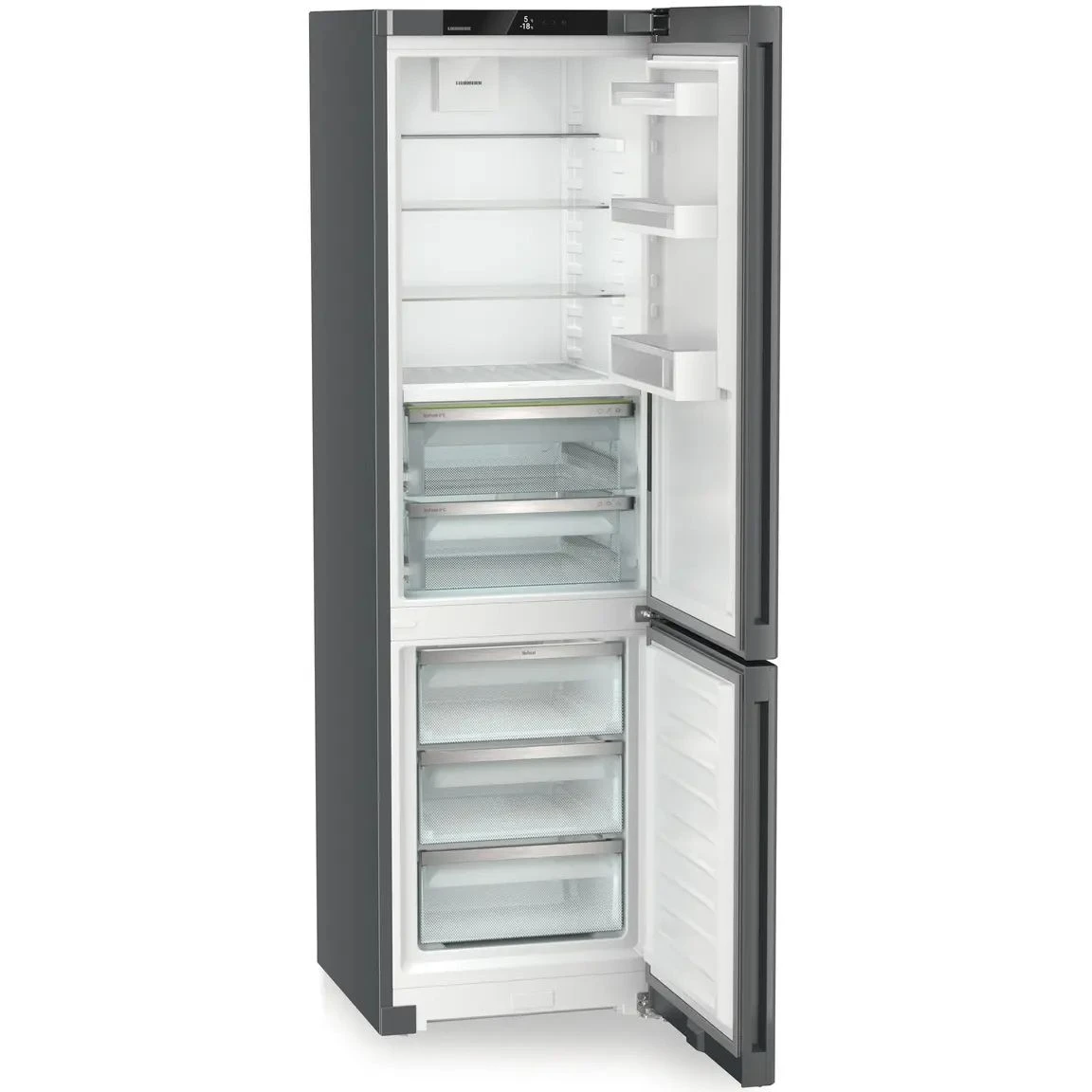 Холодильник Liebherr CBNdgc 5723 из серии Plus в цвете Dark Grey представляет собой современный домашний прибор высокого качества для вашей кухни. Модель выполнена в сером матовом цвете и оснащена инверторным компрессором, который обеспечивает тихую работу с уровнем шума до 37 дБ. Двигатель такого типа отличается долговечностью и эффективностью, позволяя точно поддерживать заданные температурные режимы в обеих камерах.