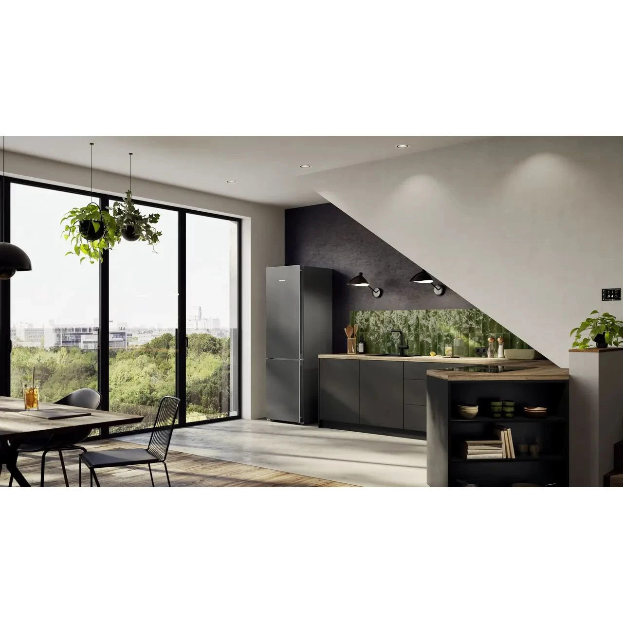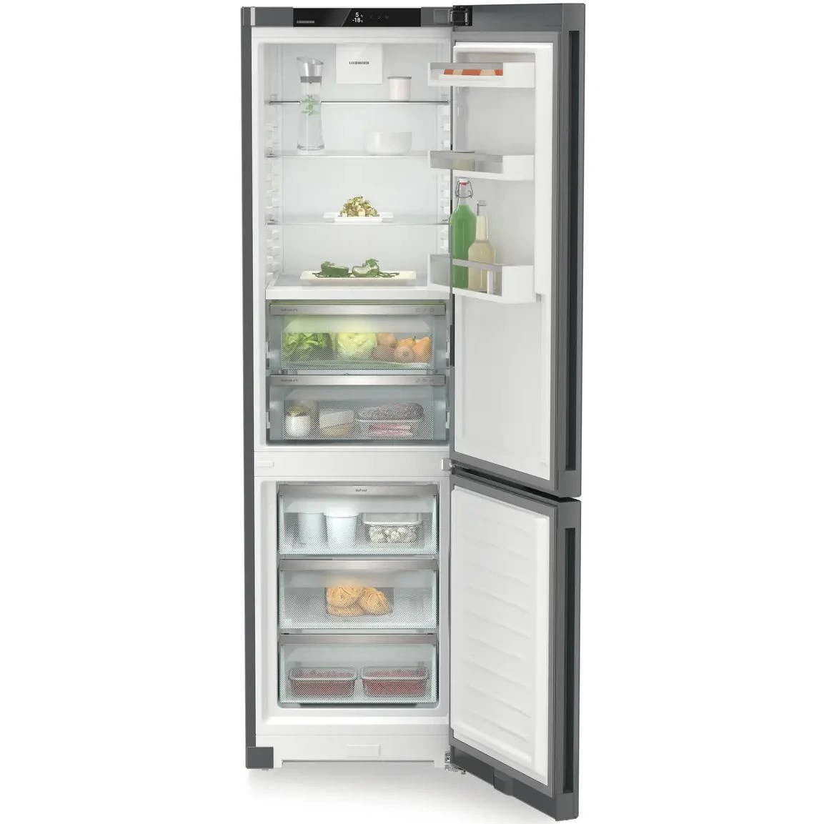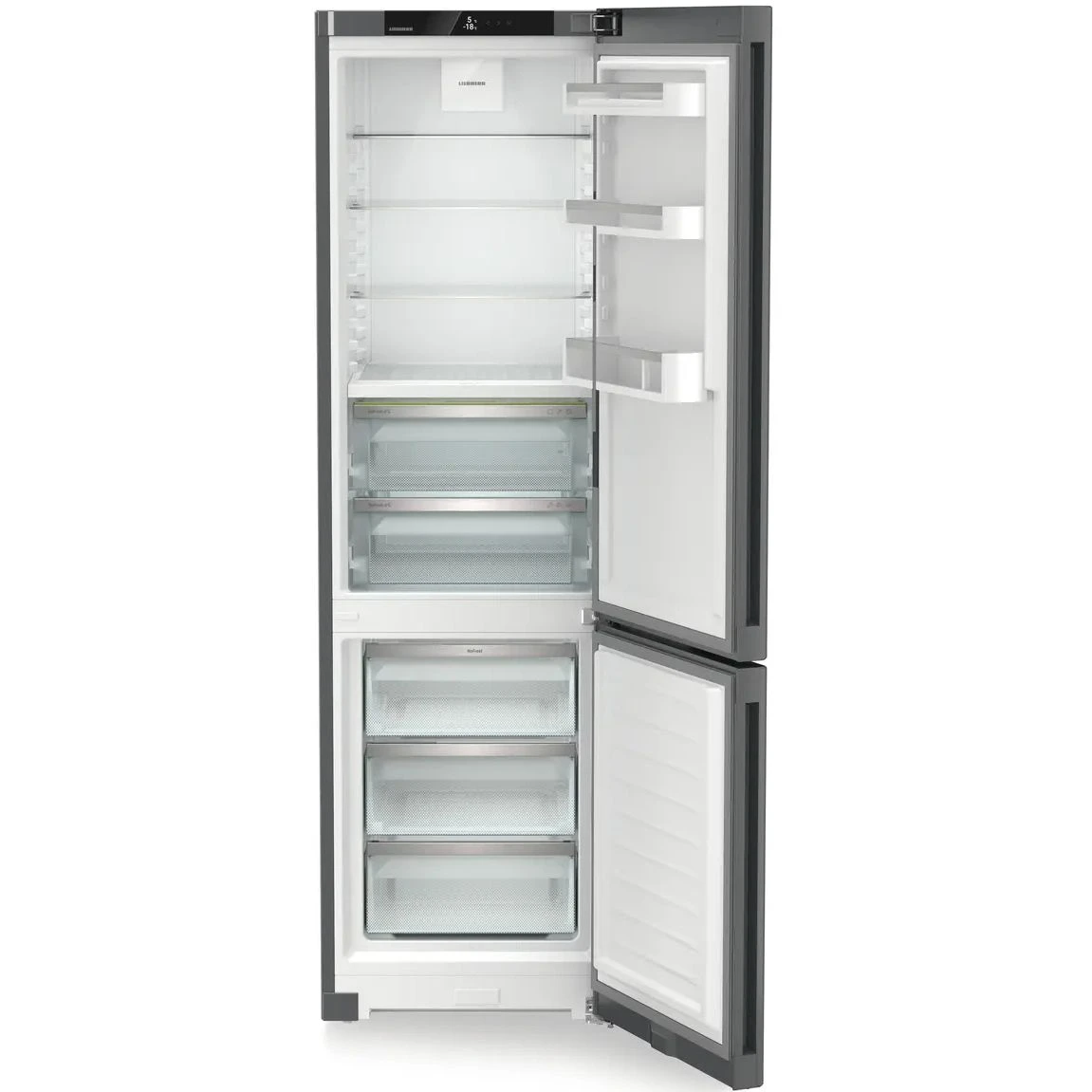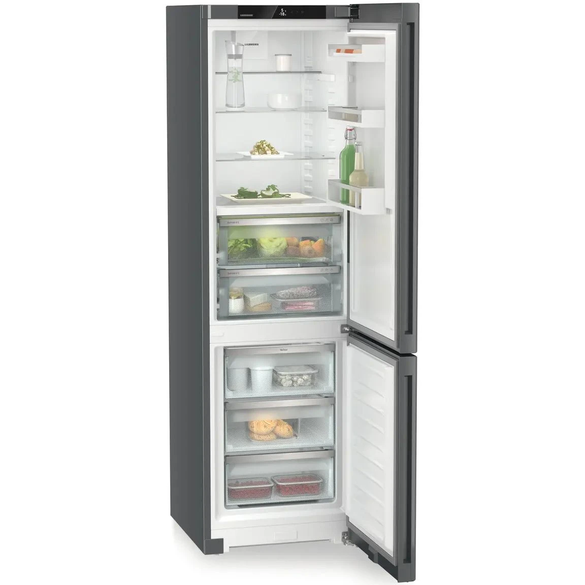 Холодильник Liebherr CBNdgc 5723 из серии Plus в цвете Dark Grey представляет собой современный домашний прибор высокого качества для вашей кухни. Модель выполнена в сером матовом цвете и оснащена инверторным компрессором, который обеспечивает тихую работу с уровнем шума до 37 дБ. Двигатель такого типа отличается долговечностью и эффективностью, позволяя точно поддерживать заданные температурные режимы в обеих камерах.