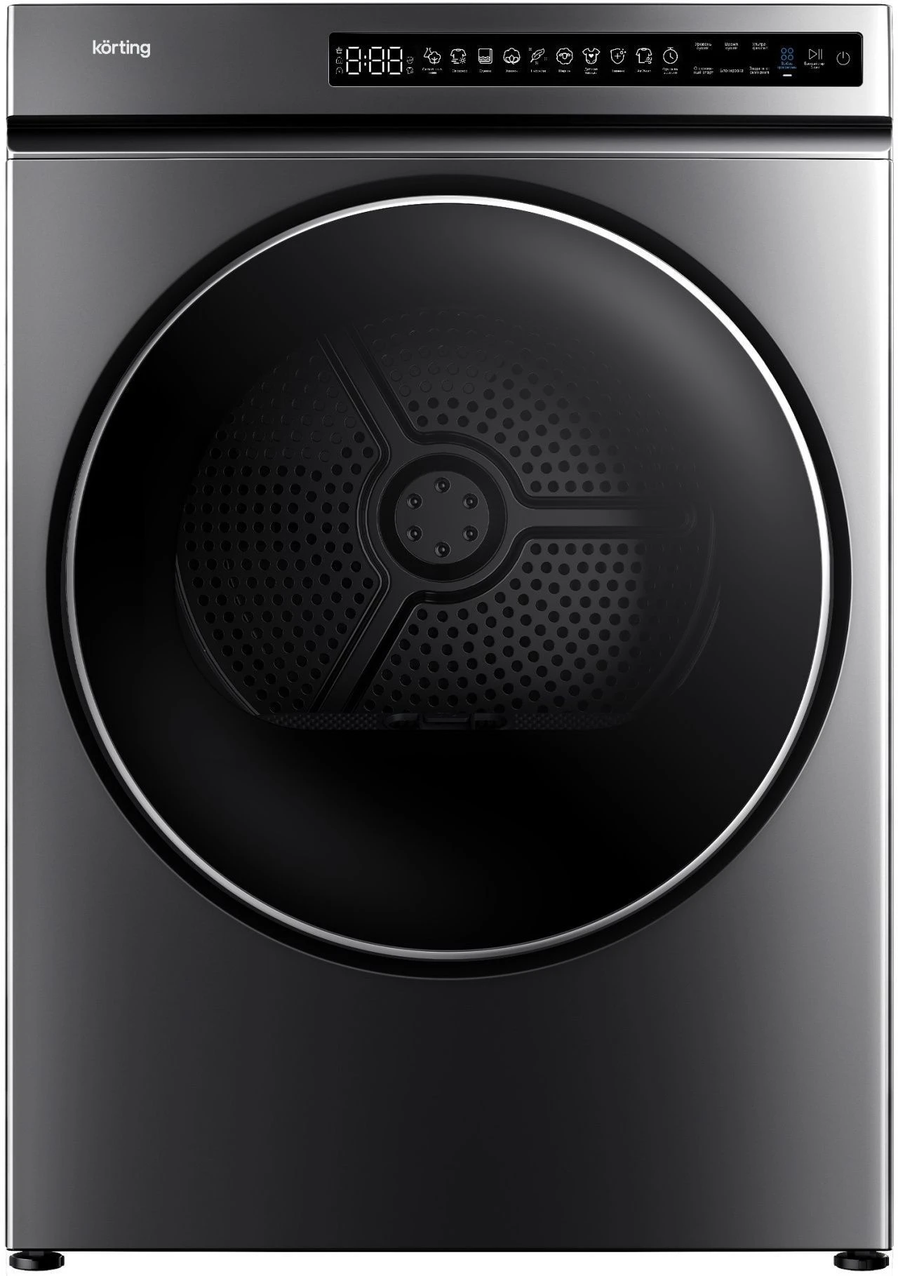 Электронное управление и LED-дисплей делают использование машины интуитивно понятным, позволяя легко выбирать программы и контролировать процесс сушки.