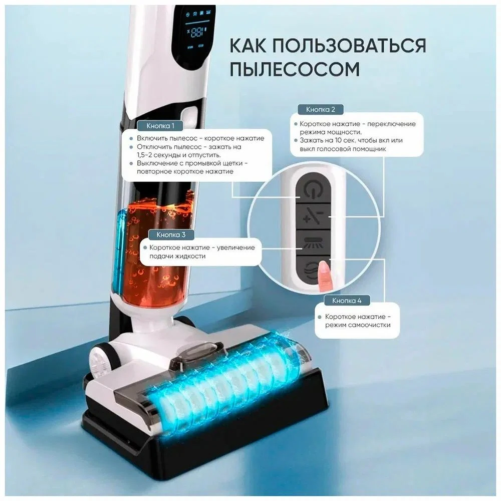 В комплекте1 х турбощетка, 1 х база самоочистки, 2 х мягкий ролик, 2 х Hepa-фильтра, 1 х щетка для очистки