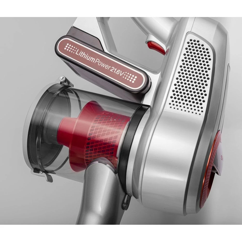 - Устройство оснащено высокоэффективной двухступенчатой циклонической системой. Благодаря ей даже мельчайшие частицы загрязнений, взвешенные в воздухе, улавливаются и надёжно удерживаются внутри контейнера для пыли