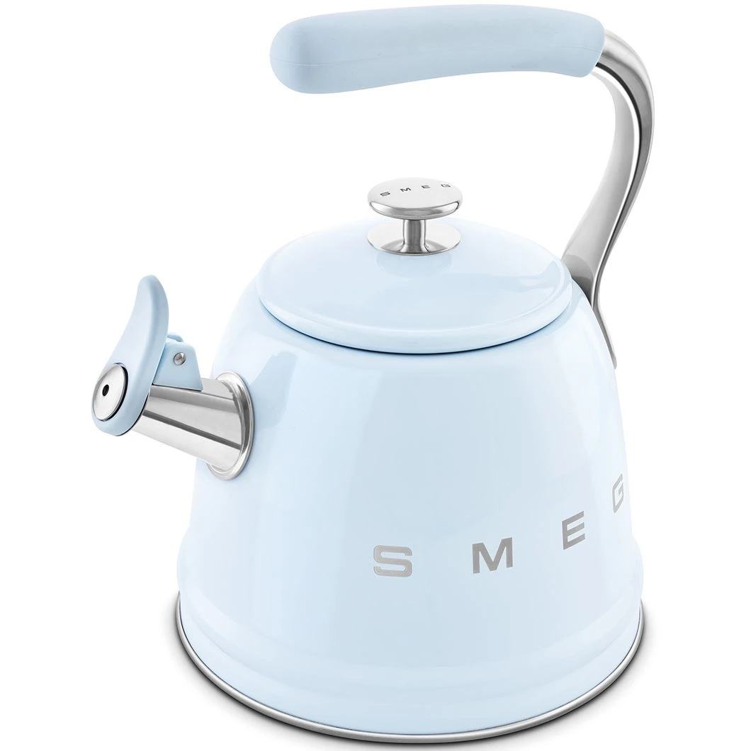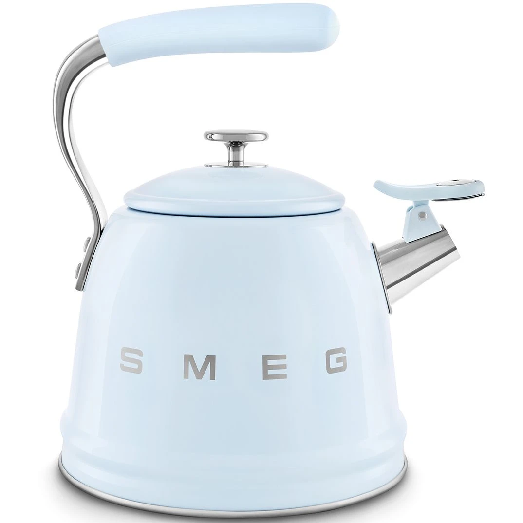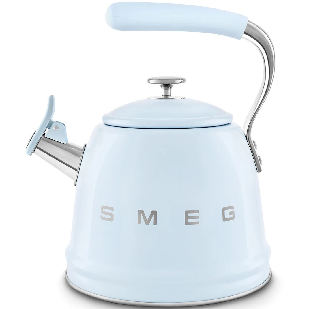 SMEG CKLW2001PB представляет собой качественный чайник со свистком в ретро стиле 50 х годов. Эта новая надежная модель сочетает классический дизайн и современные технологии для кухни. Объем чайника составляет 2.3 л, что позволяет готовить чай или кофе для всей семьи за один раз. Габариты модели: высота 277 мм, ширина 243 мм, глубина 205 мм, вес 1.34 кг.