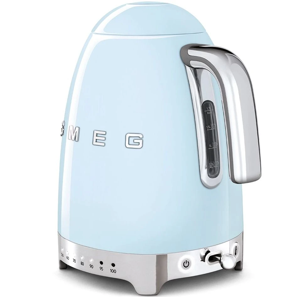 Электрический чайник Smeg KLF04PBEU в пастельно-голубом цвете станет ярким акцентом на современной кухне в стиле 50-х годов. Качественный корпус из нержавеющей стали с матовым типом поверхности обеспечивает надежность и долговечность. Объем 1.7 литра позволяет готовить напитки для большой семьи или гостей.