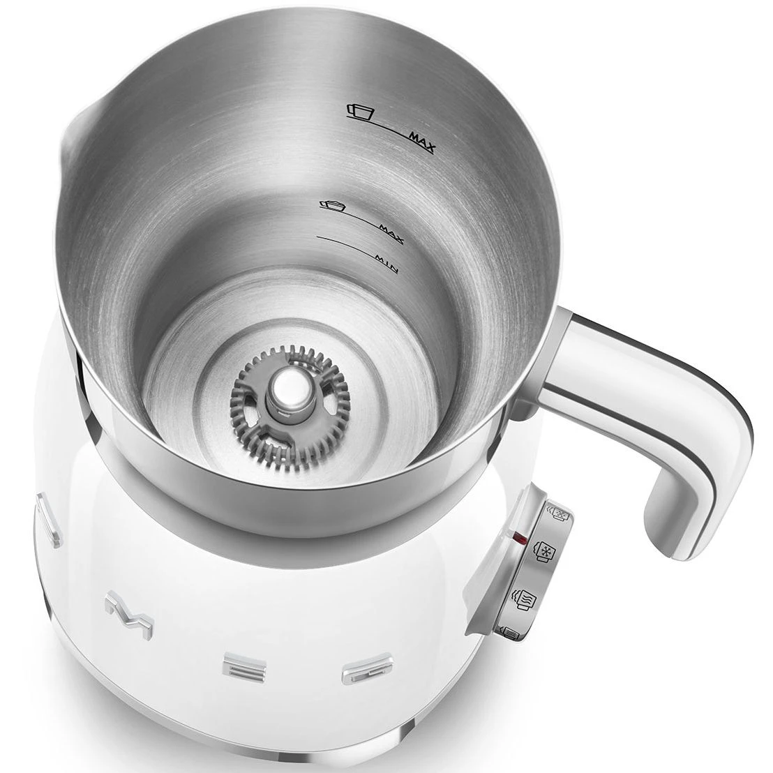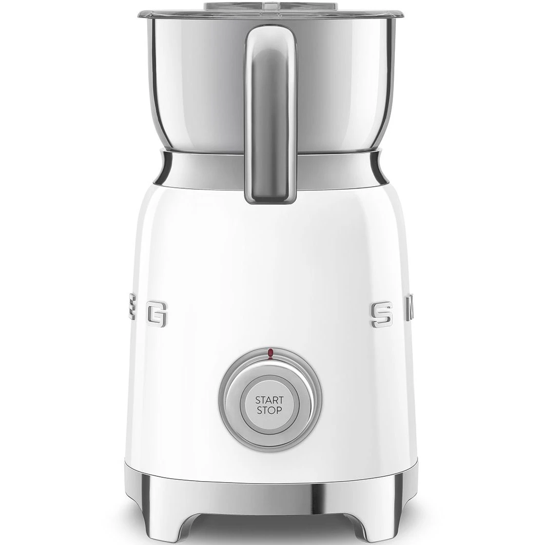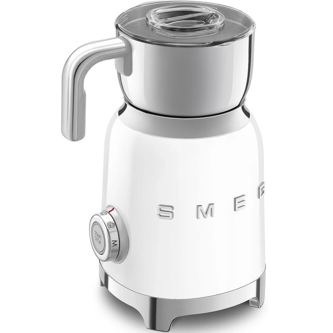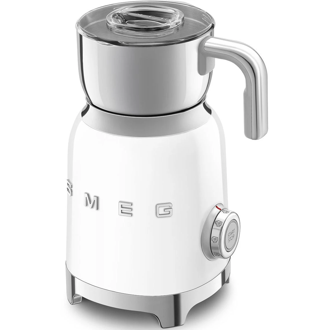 Вспениватель молока Smeg MFF11WHEU качественная новая современная техника для кухни с гарантией идеально подходит для приготовления плотной или легкой пены горячего шоколада и других напитков. Эта надежная модель с корпусом из нержавеющей стали и пластика в белом или серебристом цвете оснащена съемной чашей объемом 600 мл с прозрачной крышкой для удобного контроля процесса.