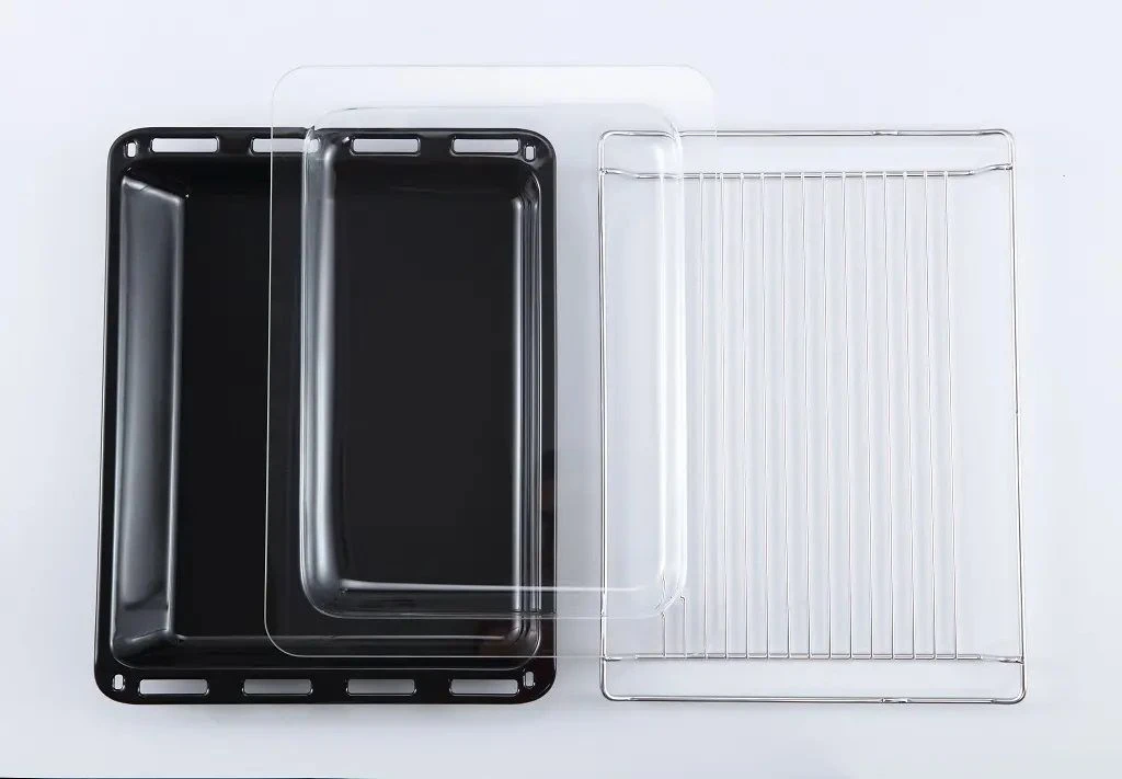 В комплекте1 х хромированная решетка, 1 х противень 45 мм, 1 х стеклянный противень