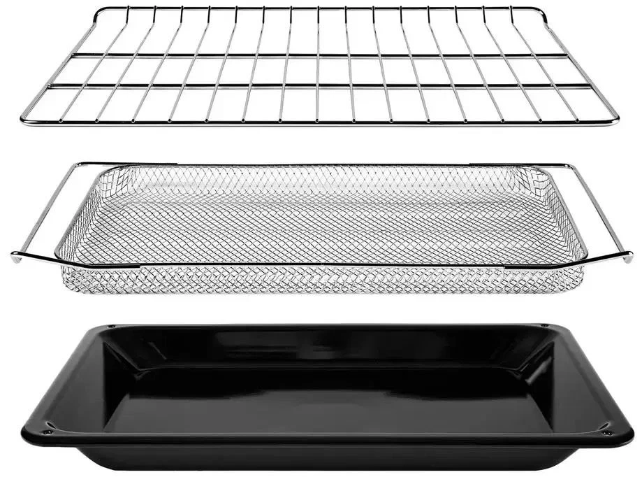 Внутренняя камера покрыта эмалью легкой очистки, что значительно упрощает уход после использования. Съемная дверца с двойным стеклом обеспечивает удобный доступ для мытья. В комплект входят необходимые аксессуары: противень глубиной 45 мм, решетка с функцией Stop и противень-аэрогриль, которые расширяют возможности для приготовления разнообразных блюд. "