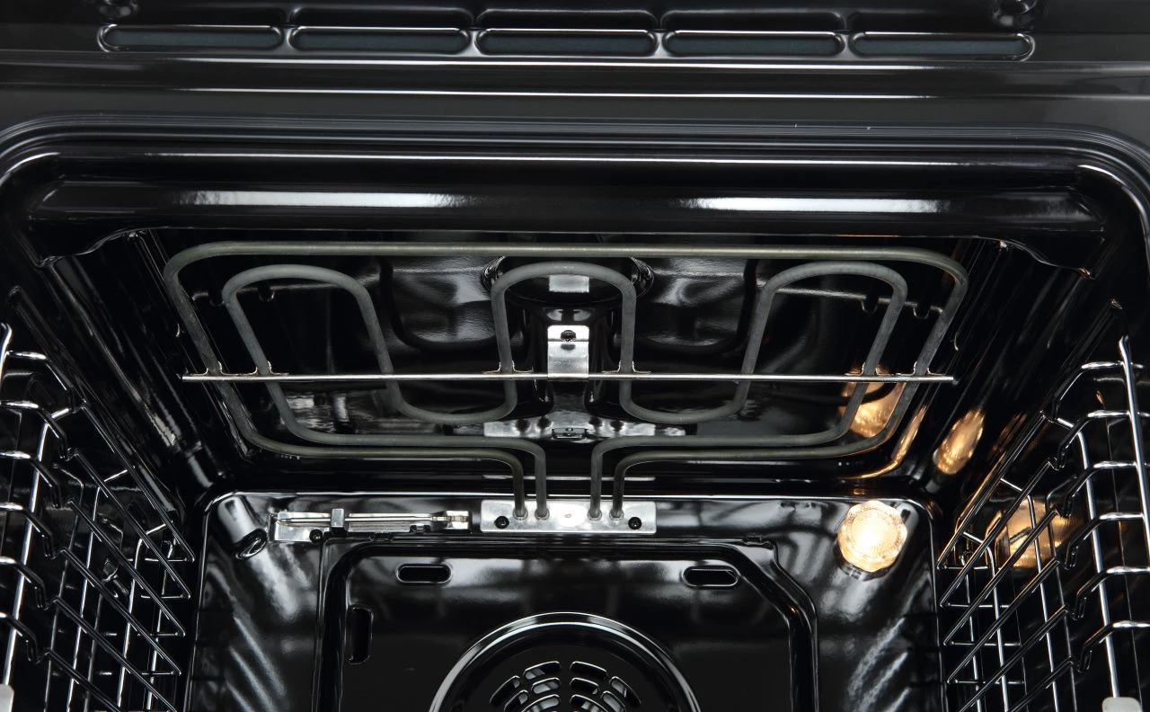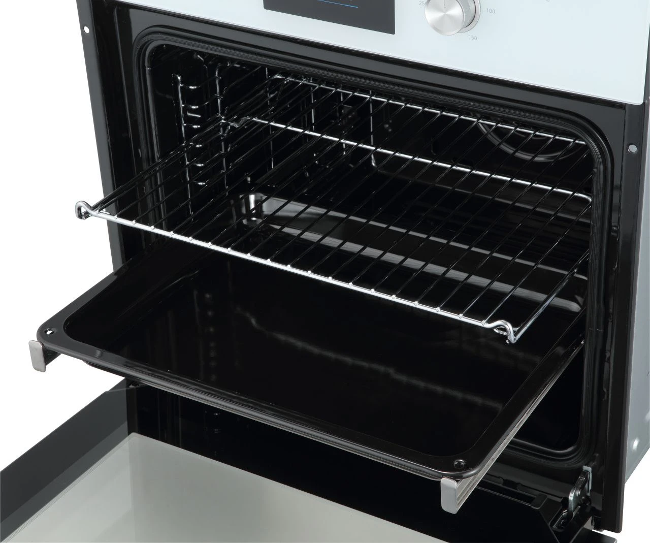 В камере предусмотрены хромированные боковые решетки с пятью уровнями установки противней. На одном из уровней установлены телескопические направляющие, которые позволяют безопасно выдвигать горячий противень за пределы духовки. Это значительно упрощает процесс проверки готовности блюда или добавления ингредиентов без риска обжечься.