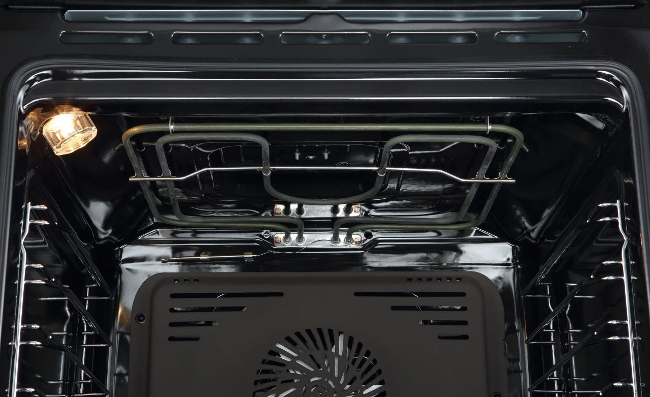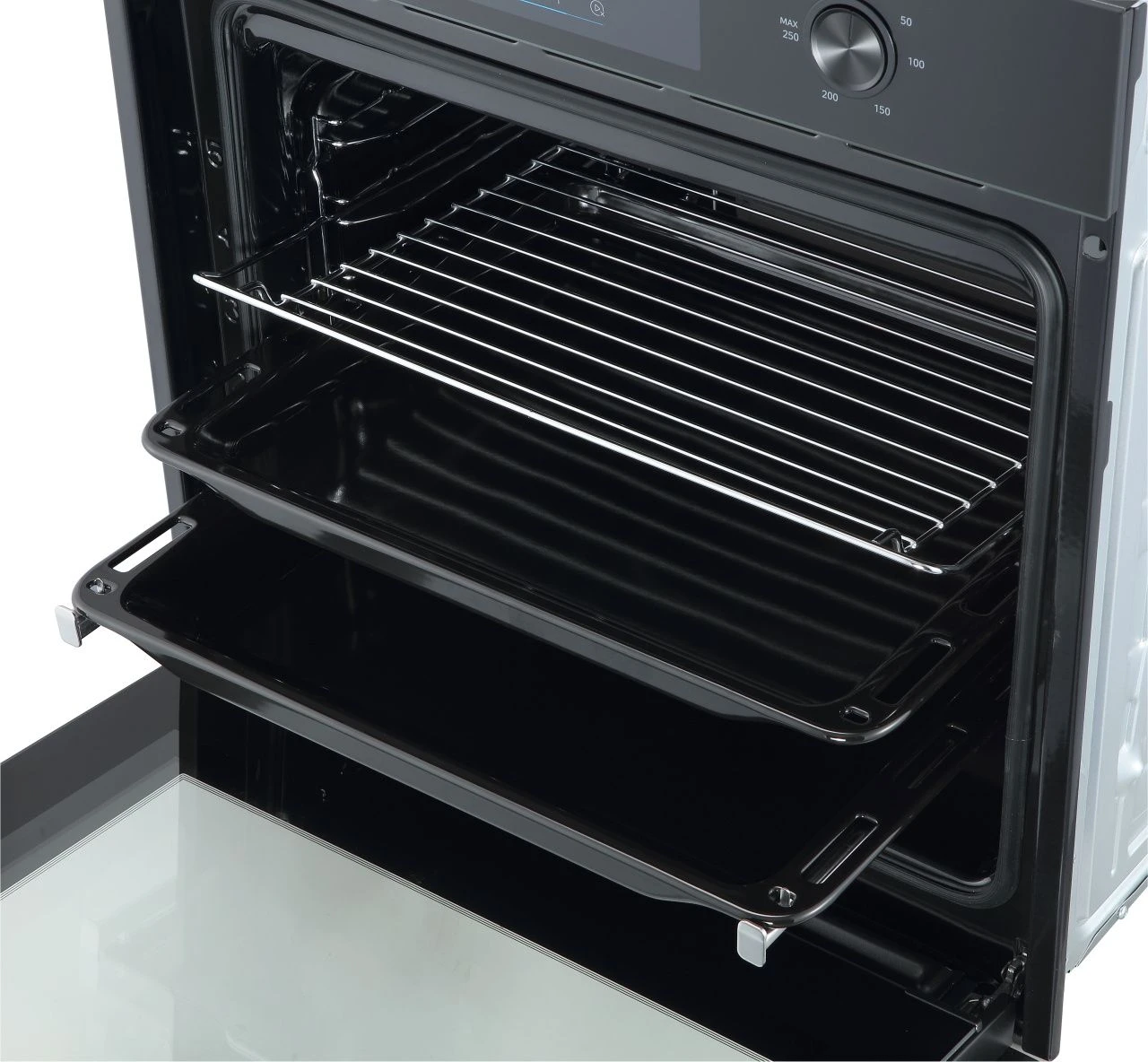 Внутренний объем духовой камеры составляет 72 л. Оборудование включает пять уровней фиксированных хромированных решеток, телескопические направляющие для плавного и безопасного перемещения противней, а также аксессуары — глубокий противень и решетку с функцией Stop. Двойная лампа подсветки мощностью 25 Вт обеспечивает хорошую видимость, а система охлаждения вентилятором защищает внешние поверхности от перегрева.