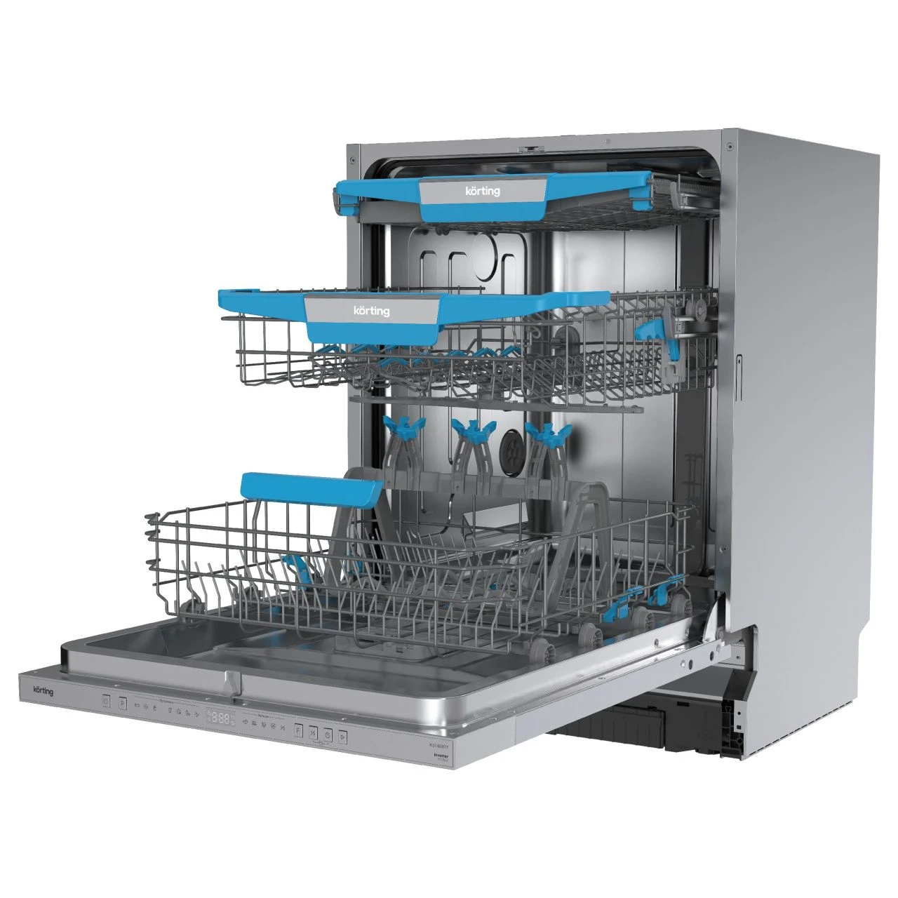 Встраиваемая посудомоечная машина Korting KDI 60877 представляет собой гармоничное сочетание лаконичного дизайна и продуманной функциональности, созданное для тех, кто ценит порядок и заботится о комфорте на кухне. Полностью встраиваемая конструкция позволяет скрыть агрегат за фасадом мебели, сохраняя единый стиль интерьера, а серебристая панель управления с цифровым дисплеем аккуратно прячется за дверцей, чтобы не нарушать внешний вид гарнитура.