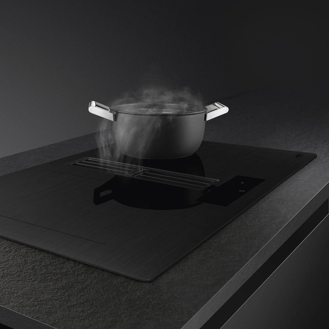Встроенная вытяжка Touch Control с восемью скоростями, интенсивным режимом и автовентиляцией регулирует мощность по температуре поверхности. Светодиодная подсветка и режим отсрочки очистки воздуха дополняют функционал.