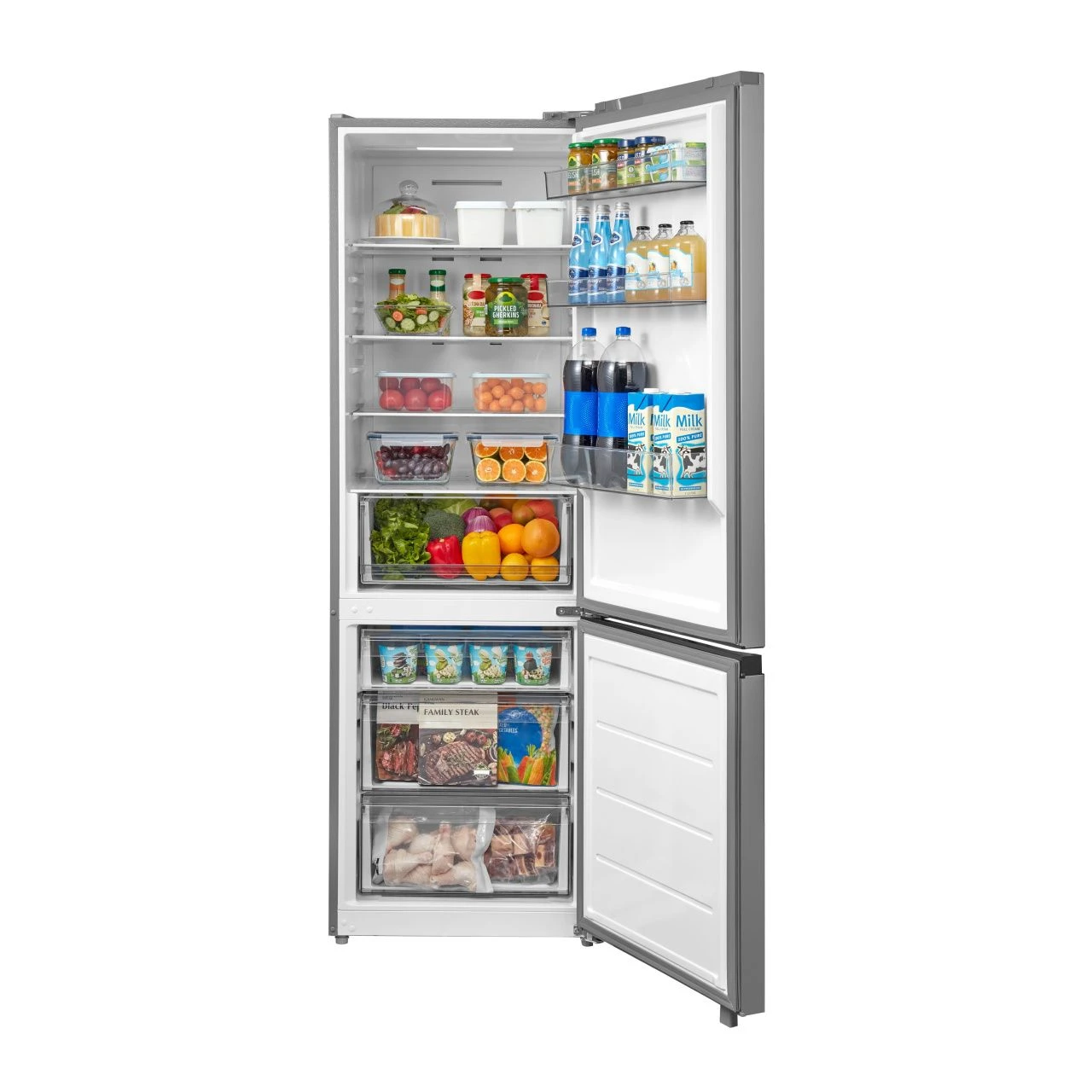 Общий полезный объём составляет 371 л, из которых 271 л отведено под холодильную камеру и 100 л — под морозильное отделение. Такой объём позволяет удобно разместить продукты для ежедневного использования и запасов на длительный срок.