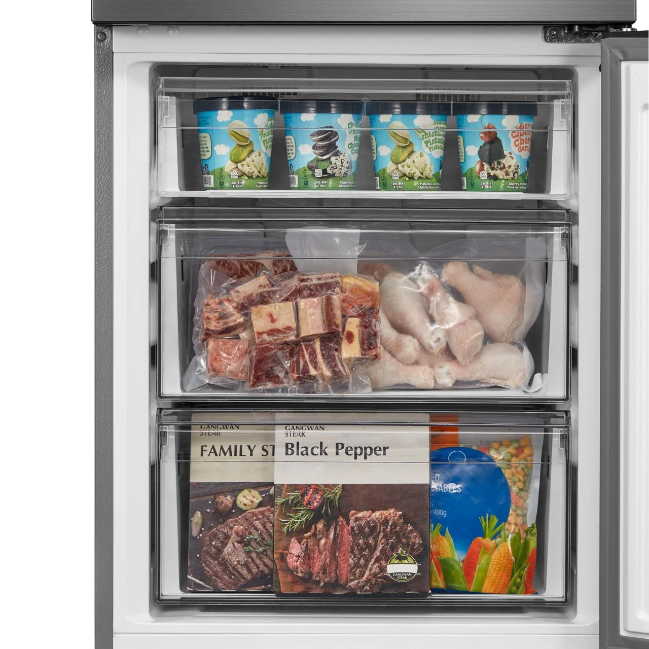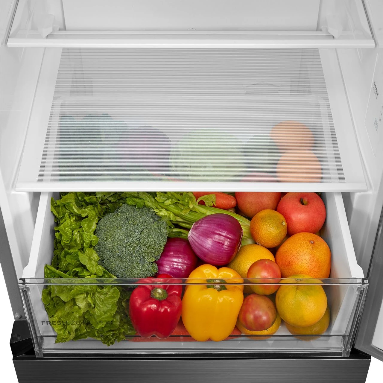 Зона свежести создаёт оптимальные условия для хранения овощей, фруктов, мяса и рыбы, сохраняя их питательные свойства и вкус дольше. LED-освещение обеспечивает яркий и энергоэффективный свет внутри камеры, позволяя быстро находить нужные продукты.