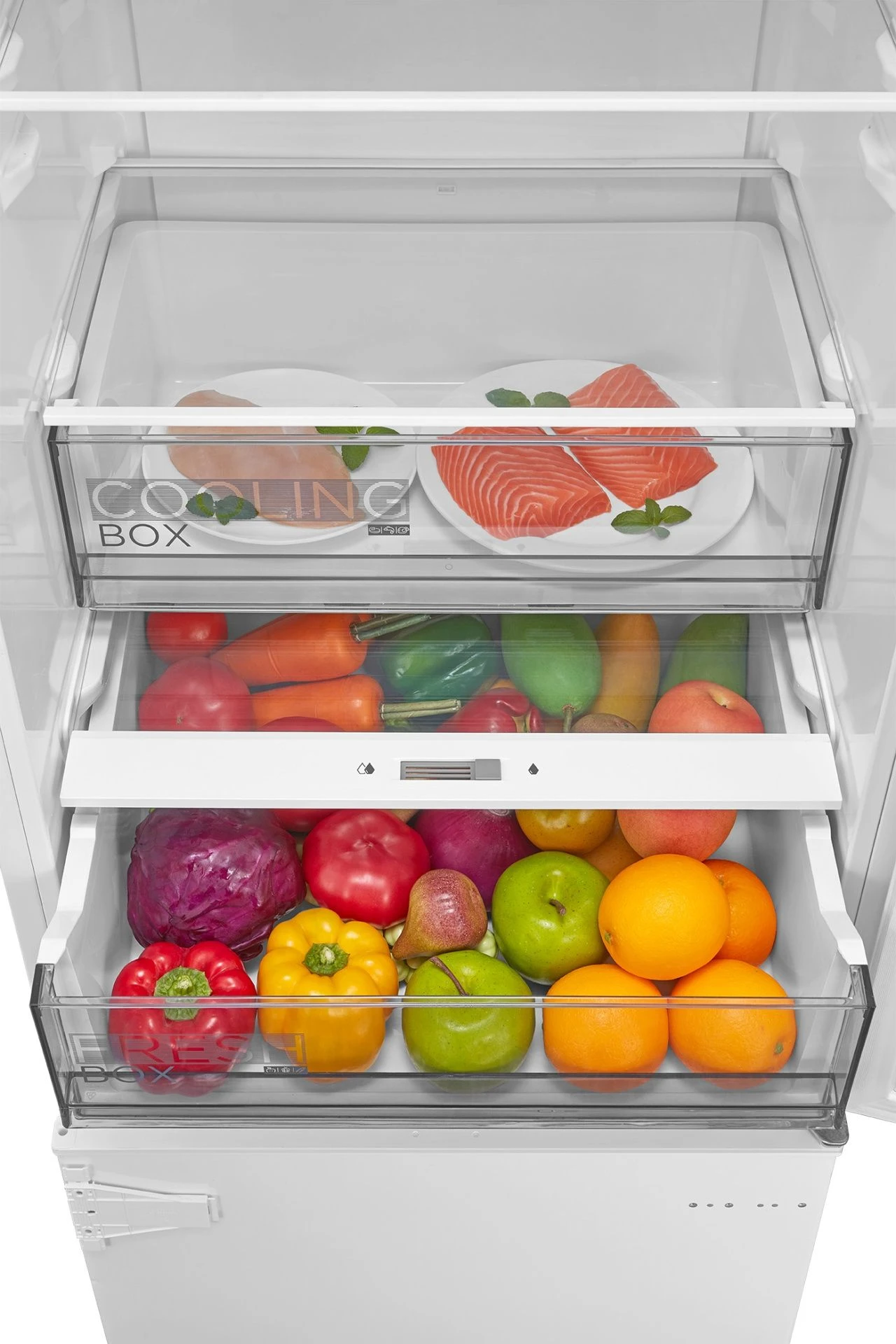 - Удобная организация: Регулируемые полки из прочного стекла, вместительные дверные карманы и ящики для овощей и фруктов позволяют удобно разместить все необходимое.