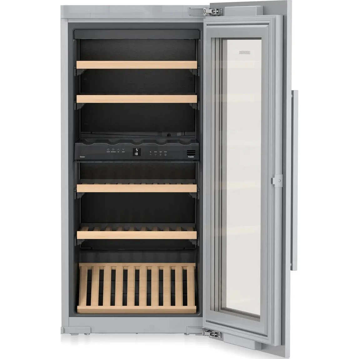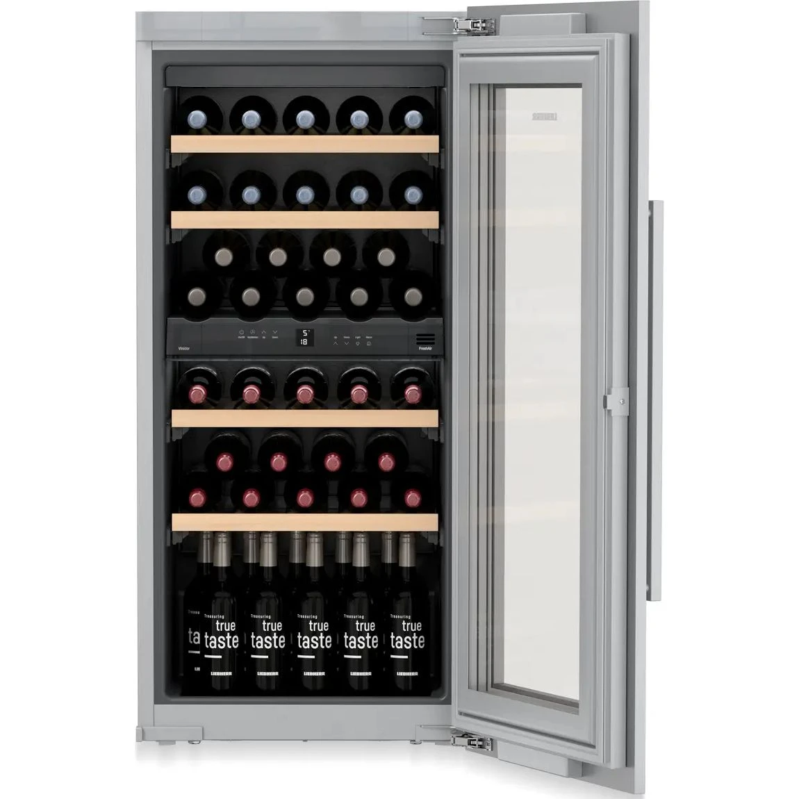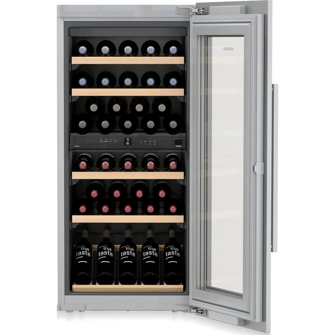Внутри предусмотрена система очистки воздуха FreshAir с фильтром из активированного угля. Она поддерживает постоянную циркуляцию чистого воздуха и снижает риск появления посторонних запахов, которые могут повлиять на вкус и аромат напитков. Такой подход к качеству хранения особенно важен, когда вино хранится долго и требуется стабильная среда.