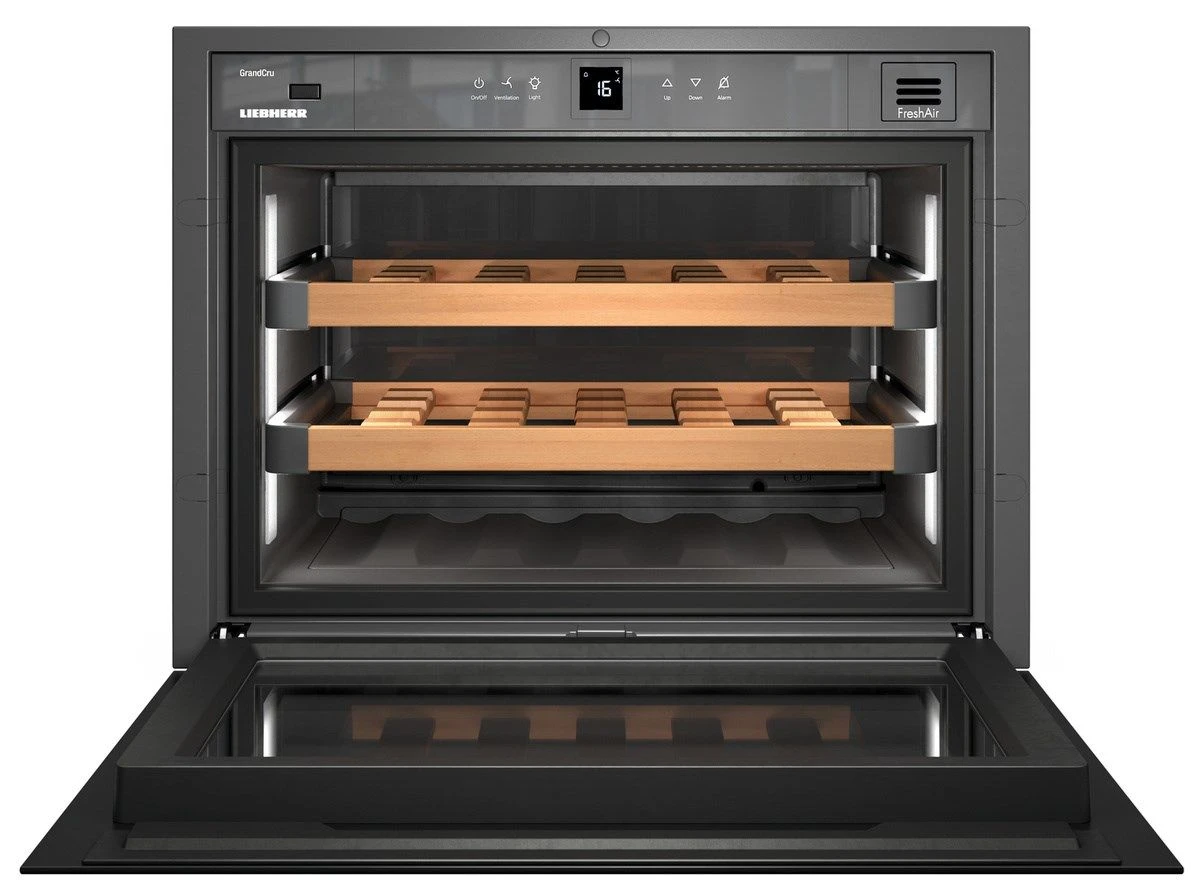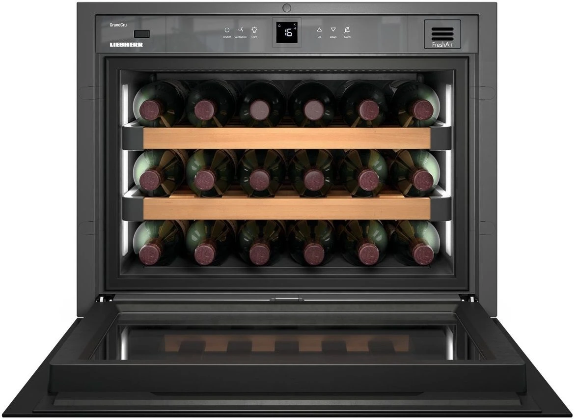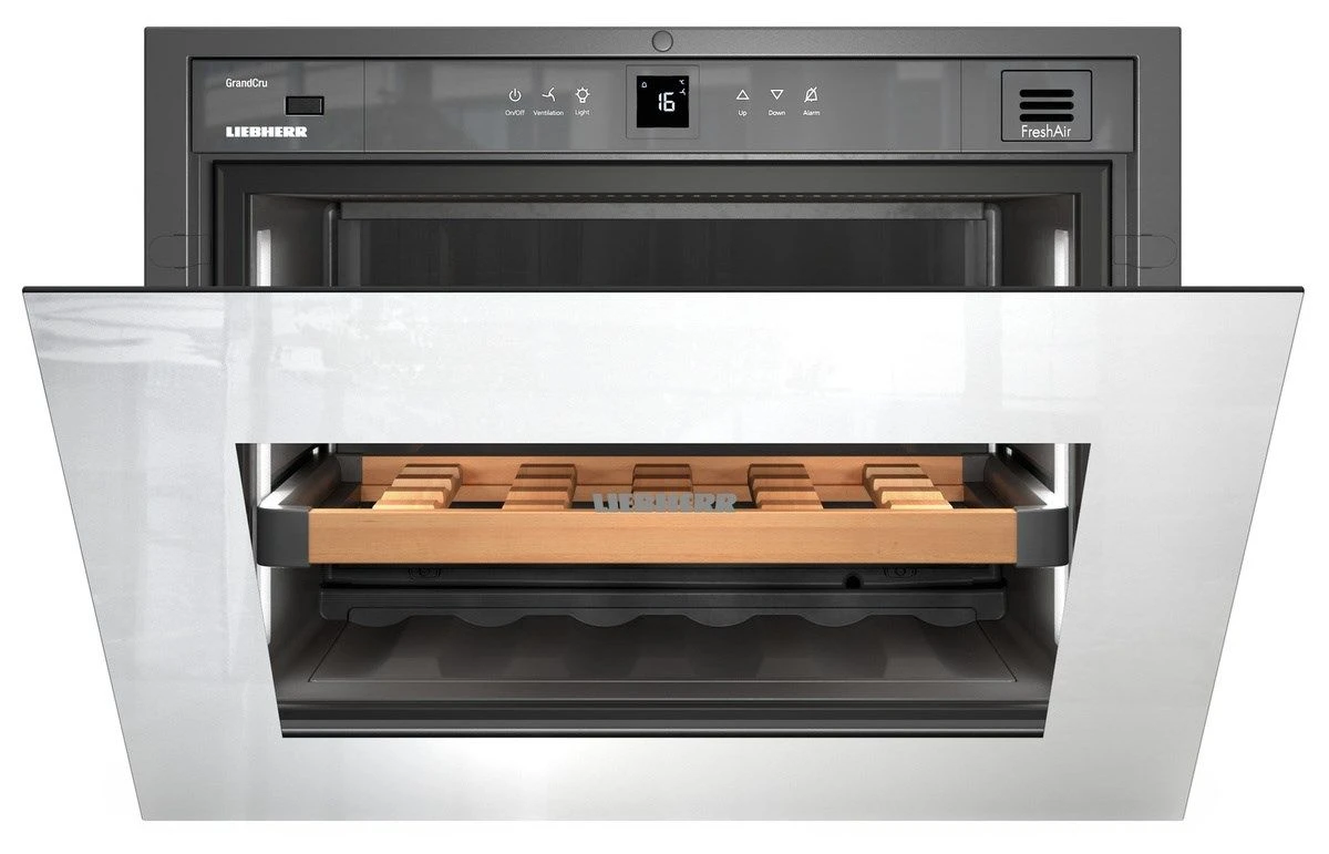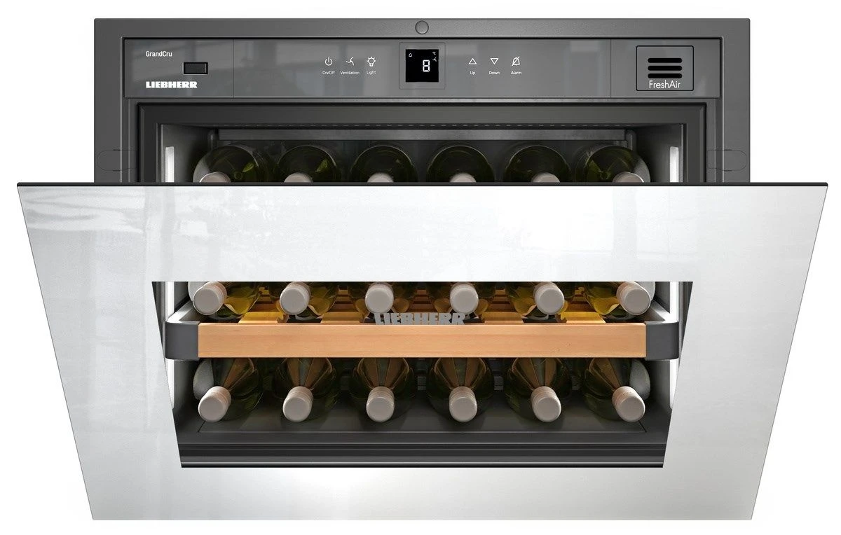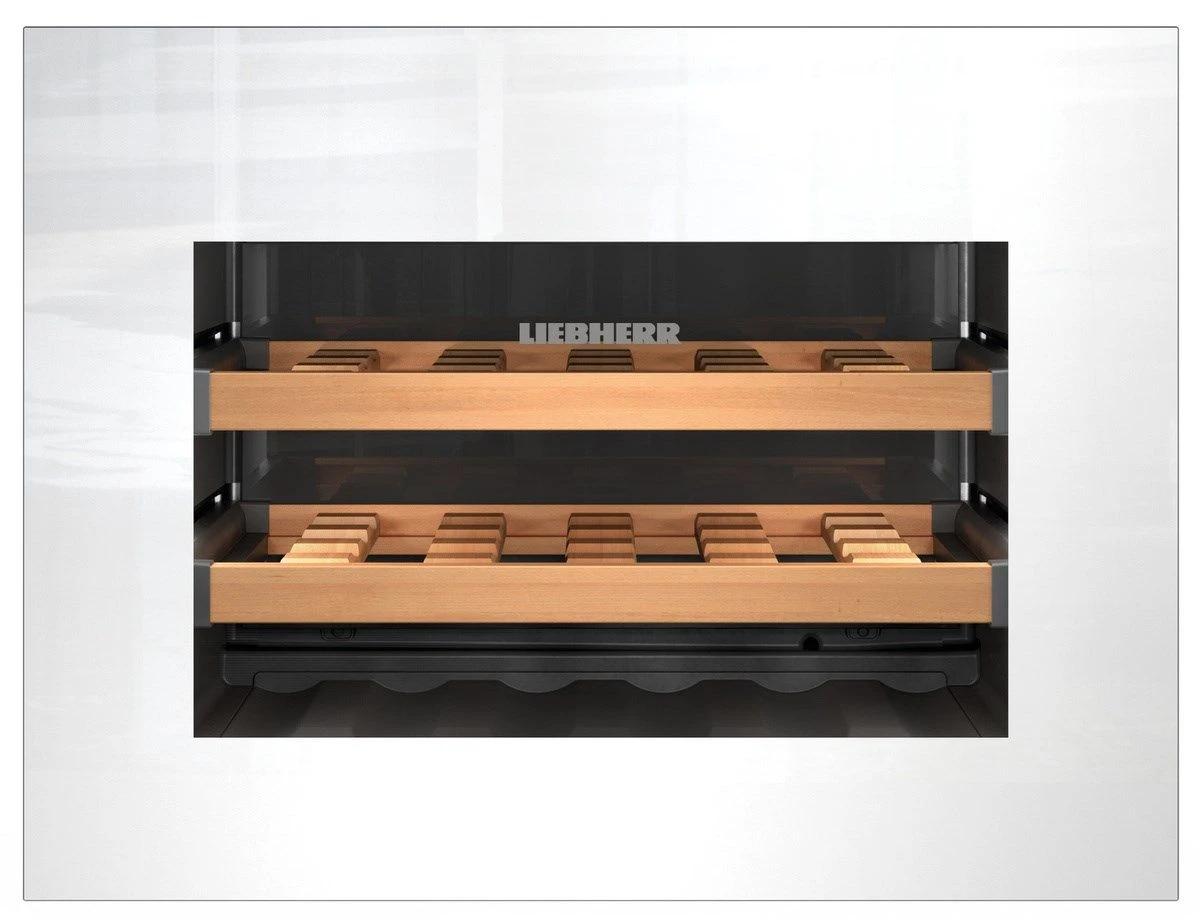 Дверь шкафа оснащена тонированным стеклопакетом который защищает содержимое от вредного ультрафиолетового излучения. Механизм открывания TipOpen позволяет легко открыть дверь легким нажатием. Встроенный доводчик SoftSystem обеспечивает плавное и бесшумное закрывание. Внутри расположены две полки из натурального дерева установленные на телескопических направляющих для удобного доступа к бутылкам. Деревянные полки также эффективно гасят вибрации что важно для правильного хранения вина.