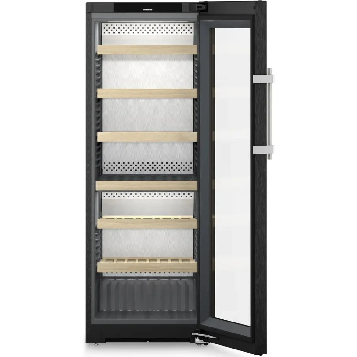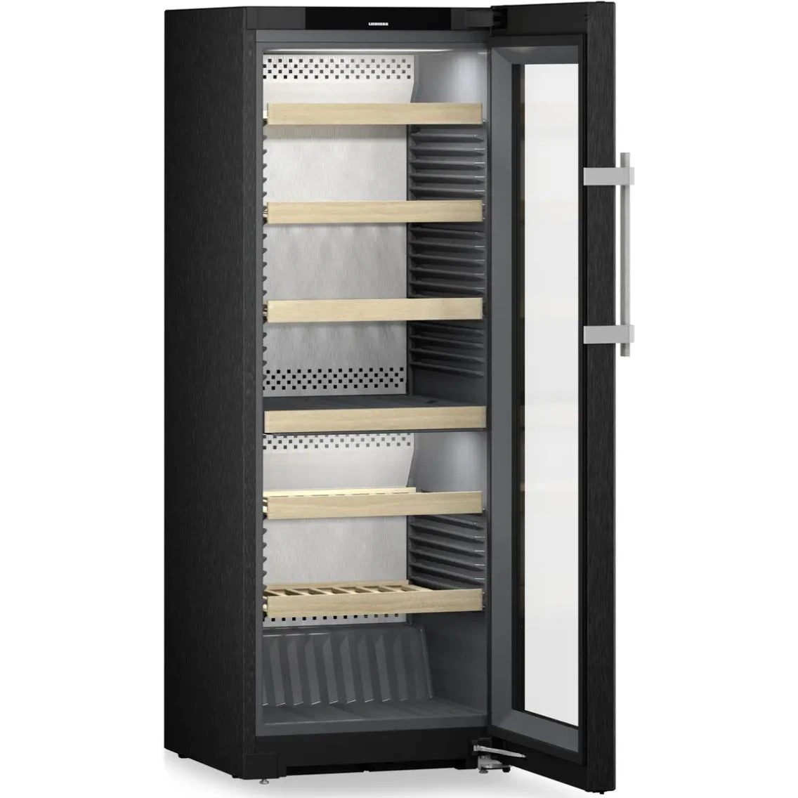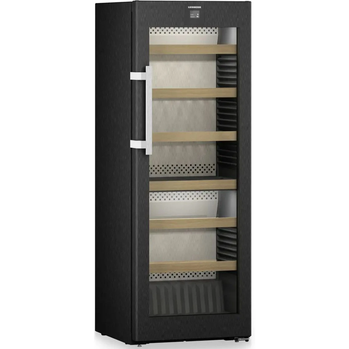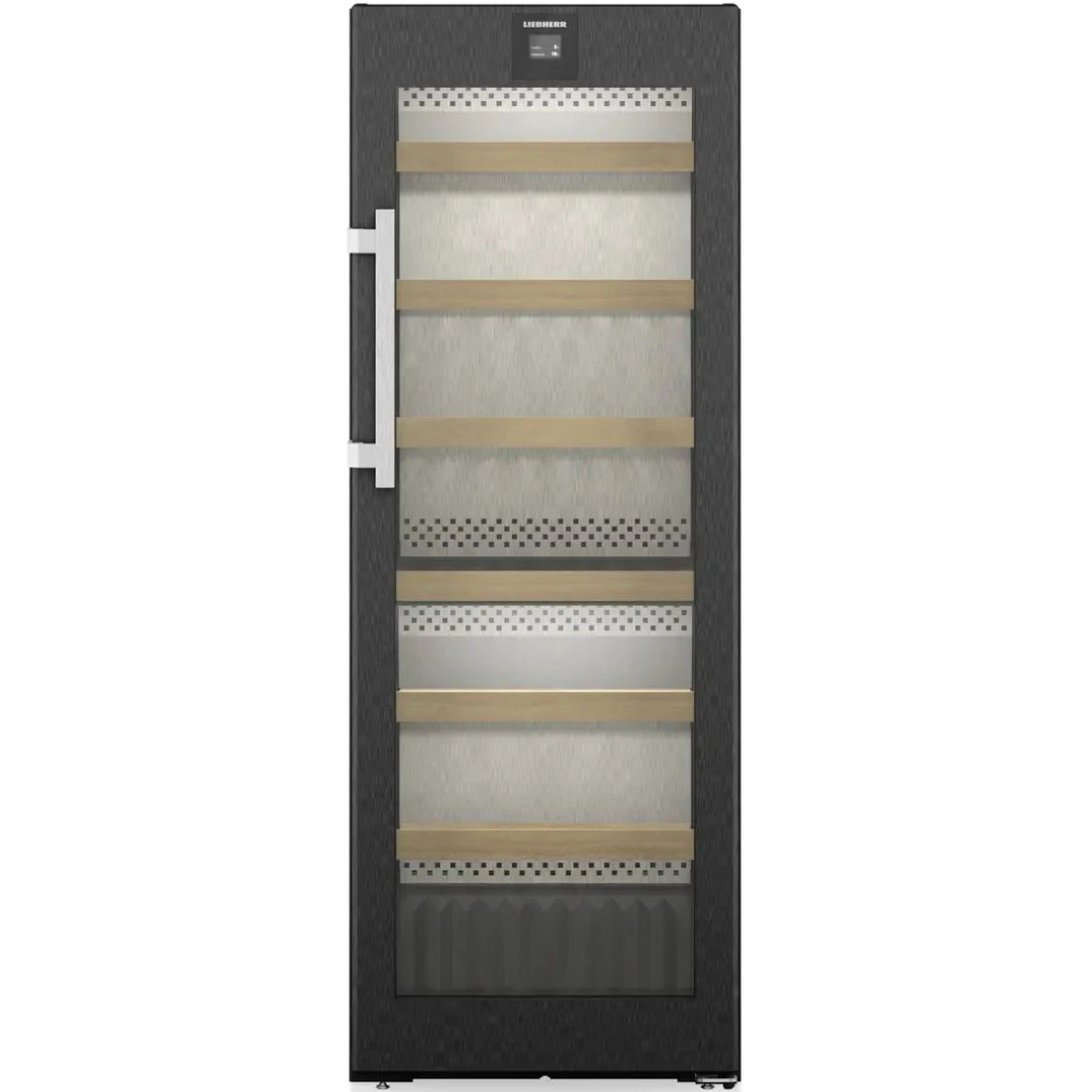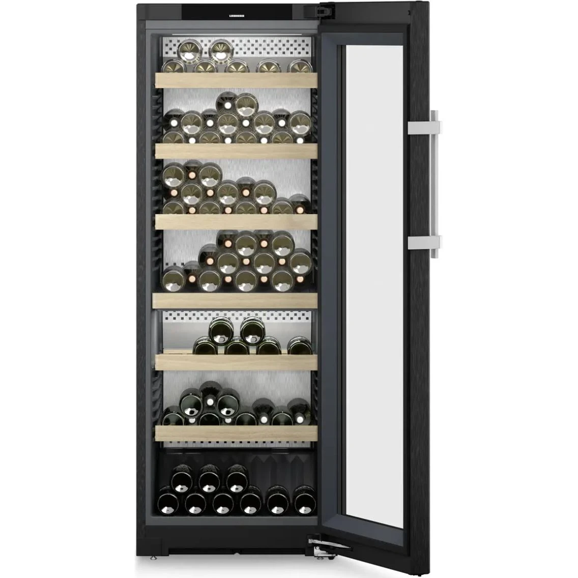 Винный шкаф Liebherr WPbsi 5052 Vinidor отличается строгим дизайном и продуманной эргономикой. Корпус из черной стали и стеклопакет в рамке выглядят солидно и стильно, а матовая поверхность боковых стенок скрывает отпечатки пальцев. Накладная ручка и дверь со стеклопакетом подчеркивают премиальную подачу бутылок, а возможность перенавешивания и доводчик добавляют удобства при установке.