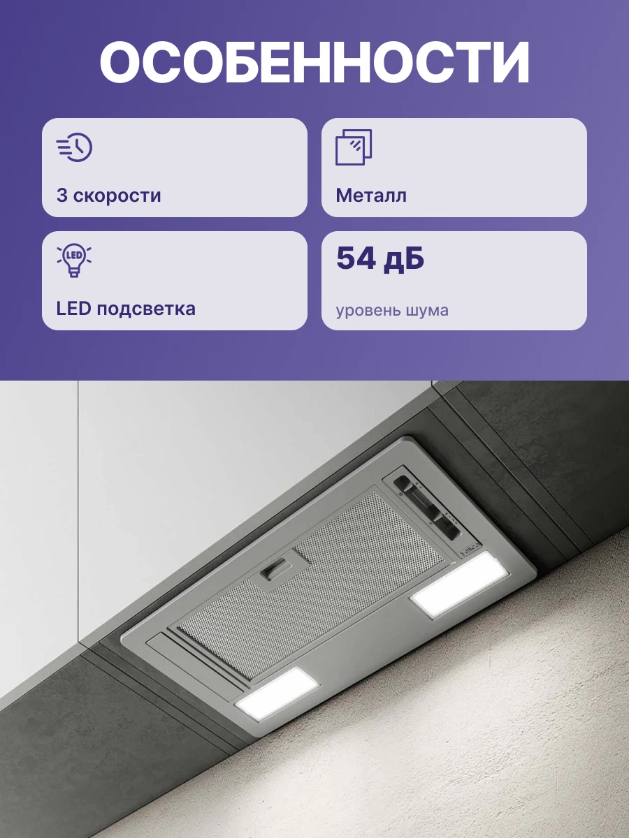 Ширина 52 см делает эту модель идеальной для небольших и средних кухонь. Мощный и надежный двигатель обеспечивает высокую производительность, эффективно удаляя запахи и избыточный пар во время приготовления. Благодаря нескольким режимам работы, вы легко сможете выбрать оптимальный уровень мощности для различных кулинарных задач.